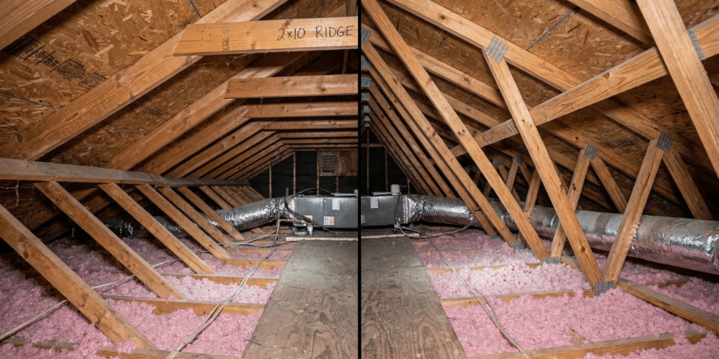 The biggest advantage of rafters is the open attic space they create. Without the web members that crisscross the interior of trusses, a rafter-framed attic can be finished into living space, a home office, a playroom, or additional storage. In the DFW real estate market, where home values have been steadily climbing, the ability to add usable square footage in the attic can provide significant return on investment.