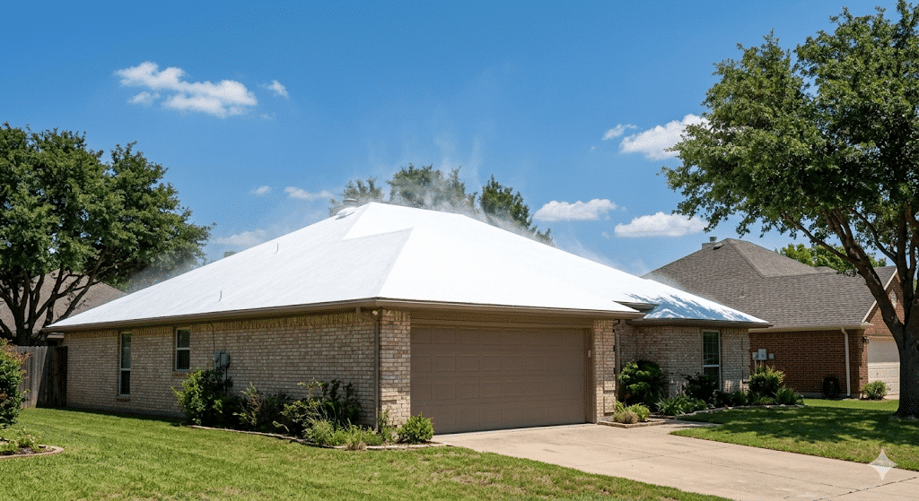 Acrylic coatings are water-based, environmentally friendly, and one of the most popular options for North Texas residential and commercial roofs. They provide strong UV reflectivity, which helps reduce cooling costs during DFW’s long, hot summers. Acrylic coatings dry to a bright white or light color that can reflect up to 85% of solar radiation, keeping attic temperatures significantly lower.