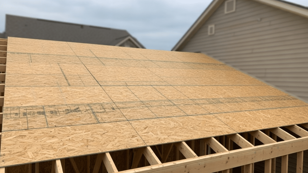 Plywood is one of the most common roof decking materials used in DFW homes. It is made from thin layers of wood veneer glued together with alternating grain directions, which gives it excellent strength, stiffness, and dimensional stability. Plywood roof decking is typically available in 4-by-8-foot sheets in thicknesses of 7/16 inch, 1/2 inch, 5/8 inch, and 3/4 inch, with 1/2 inch and 5/8 inch being the most common for residential roofs.